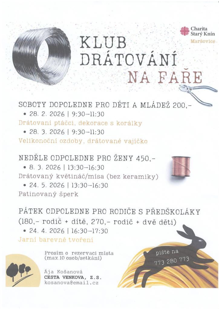 Klub drátování na faře nabízí tvořivé odpoledne pro děti, mládež a ženy. Děti a mladí lidé se mohou těšit na práci s drátem, kde si vytvoří ptáčky a dekorace s korálky. Pro ženy jsou připraveny drátované květináče/mísy a patinované šperky. Rodiče s předškoláky si užijí jarní barevné tvoření.